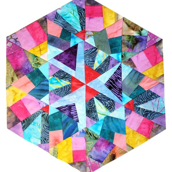 An enthralling way to spend a day! Learn to improvise stitch-and-flip triangles on unmarked scrap paper. This is NOT English Paper Piecing or foundation paper piecing - it's much more relaxing! Join 20 triangles into a sparkling “kaleidoscope,” like in the photos. Make a table mat, pillow, wall hanging, or start a larger quilt.
